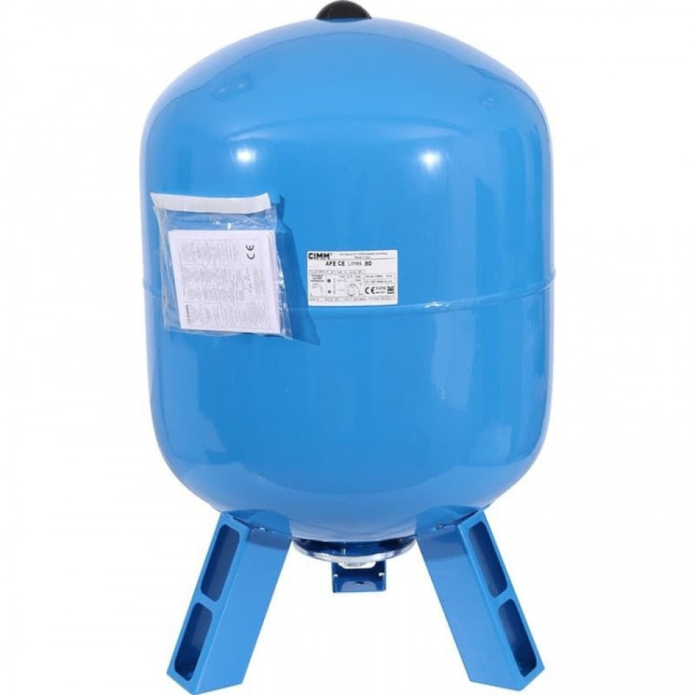 Вертикальный гидроаккумулятор Итальянского производства для воды Cimm AFE CE 80 литров. Применяется в системах бытового водоснабжения в паре с погружными насосами и поверхностными. Служит для уравнивания рабочего давления в водопроводных сетях. Внешне корпус бака окрашен порошковой эмалью синего цвета.