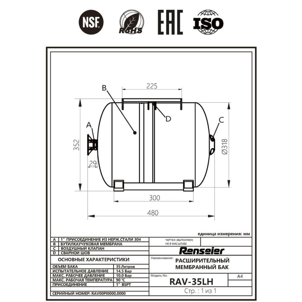 Гидроаккумулятор Renseier RAV-35LH горизонтальный