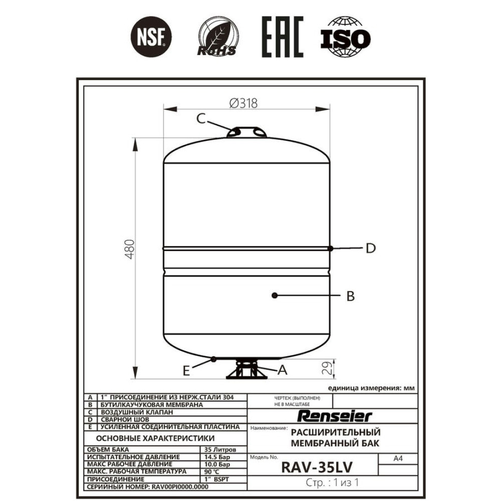Гидроаккумулятор Renseier RAV-35LV вертикальный
