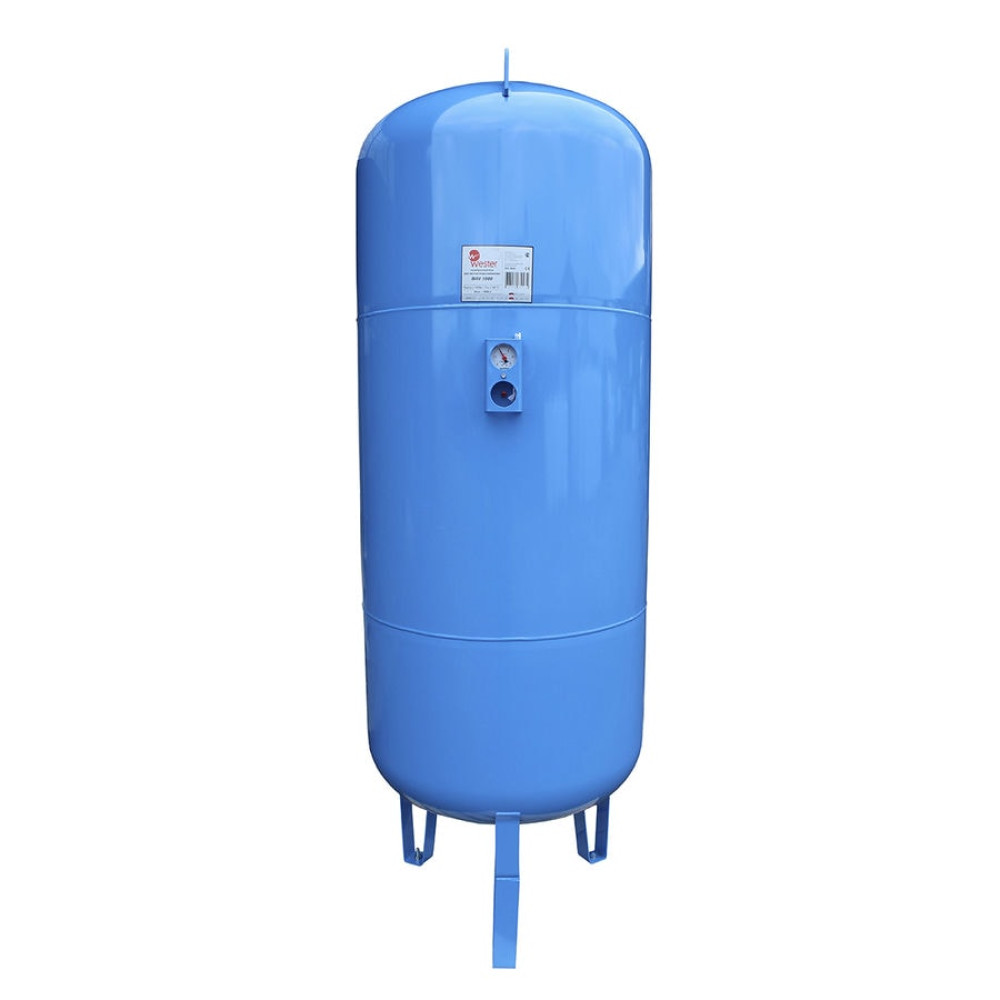 Гидроаккумулятор Wester на 1000 литров вертикального типа предназначен для систем питьевого водоснобжения. Используются с погружными и скваженными насосами. Гидроаккумулятор Wester WAV-1000 имеет проходную мембрану узкую вытянутую форму что позволяет его использовать в ограниченном пространстве например в кессоне для скважины или маленькой котельной. Гидроаккумуляторы Wester 1000 литров предназначены для поддержания давления воды в системе а так же для компенсации гидравлических ударов. Встроенный манометр давления воздуха.