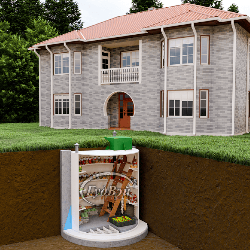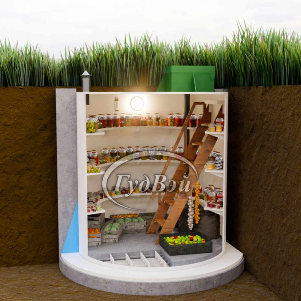 Погреб "ГудВэй Круглый" с входом на уровне земли и классической лестницей представляет собой отличное решение для тех, кто ищет максимально вместительное хранилище с экономией пространства на участке или под другими построенными сооружениями. В сравнении с квадратным погребом размером 2х2х2, круглая версия занимает гораздо меньше места. Кроме того, многим заказчикам круглая форма кажется более привлекательной по сравнению с другими моделями.