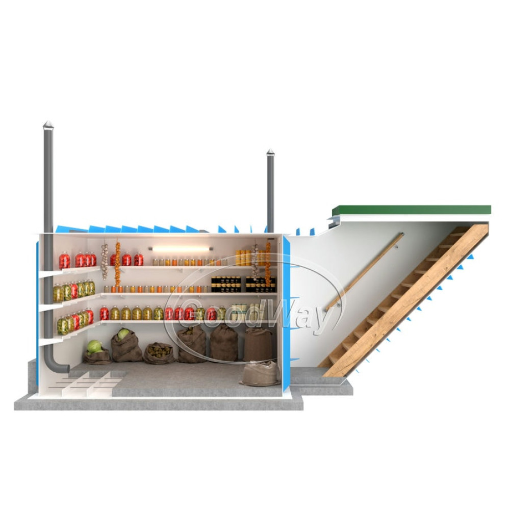 Этот погреб – идеальное место для хранения вина, маринованных грибов, квашеной капусты, консервированных помидоров, огурцов, картофеля, лука и других продуктов. Установка модели "ГудВэй Люкс" возможна практически в любом уголке вашего участка: под открытым небом, в гараже, в хозяйственном блоке и т. д.