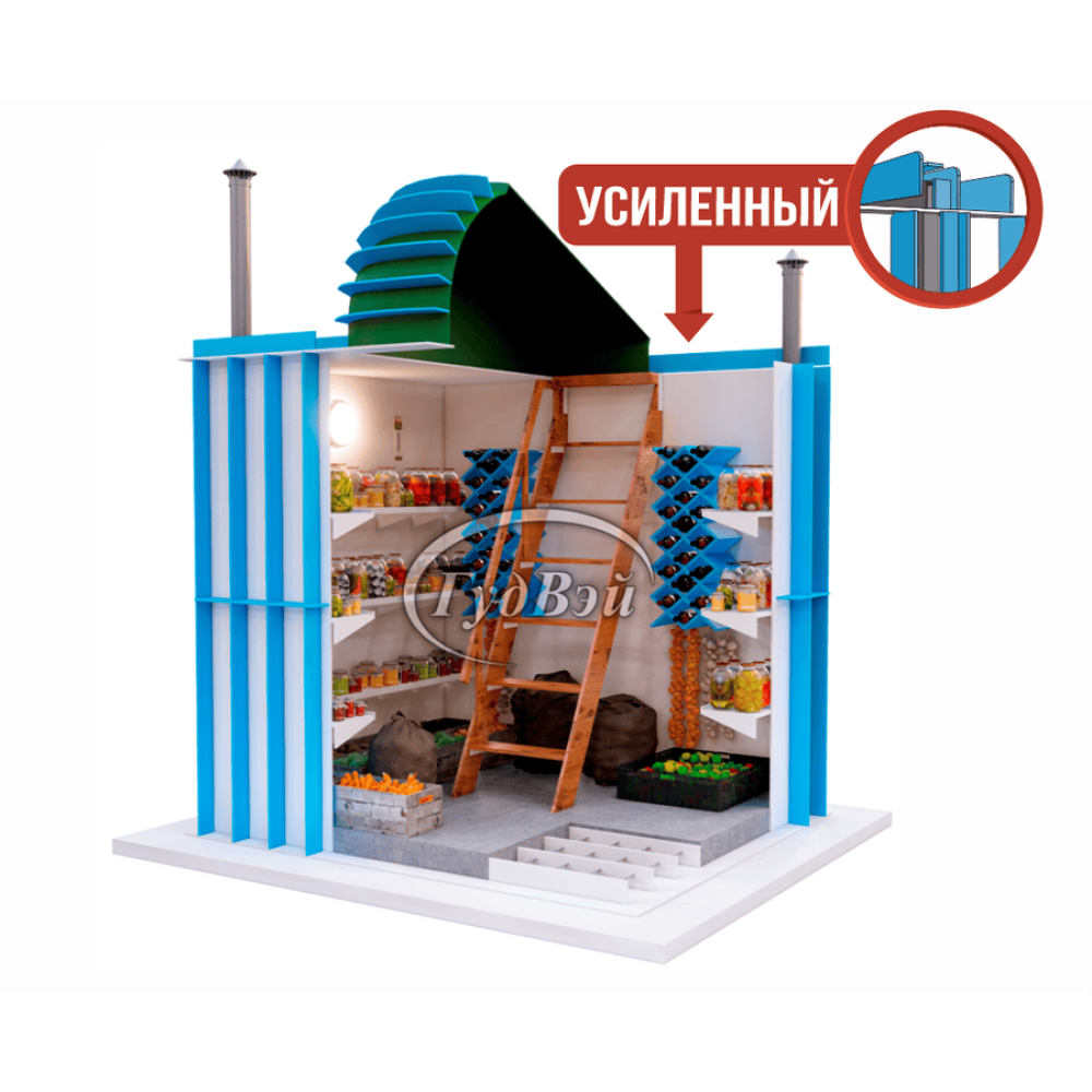 Погреб "ГудВэй Оптимум +" с наклонным входом от уровня земли предлагает наилучшее решение для тех, кто ищет качественное и доступное помещение для хранения в загородном доме или на даче! В данной модели предусмотрена идеальная комплектация: три полки для продуктов, пространство от пола для мешков и коробок, две винные полки и удобная лестница с поручнем. Этот погреб не занимает много места на участке и имеет дискретный наклонный вход. Простота с аристократическим шармом - вот девиз этой модели.