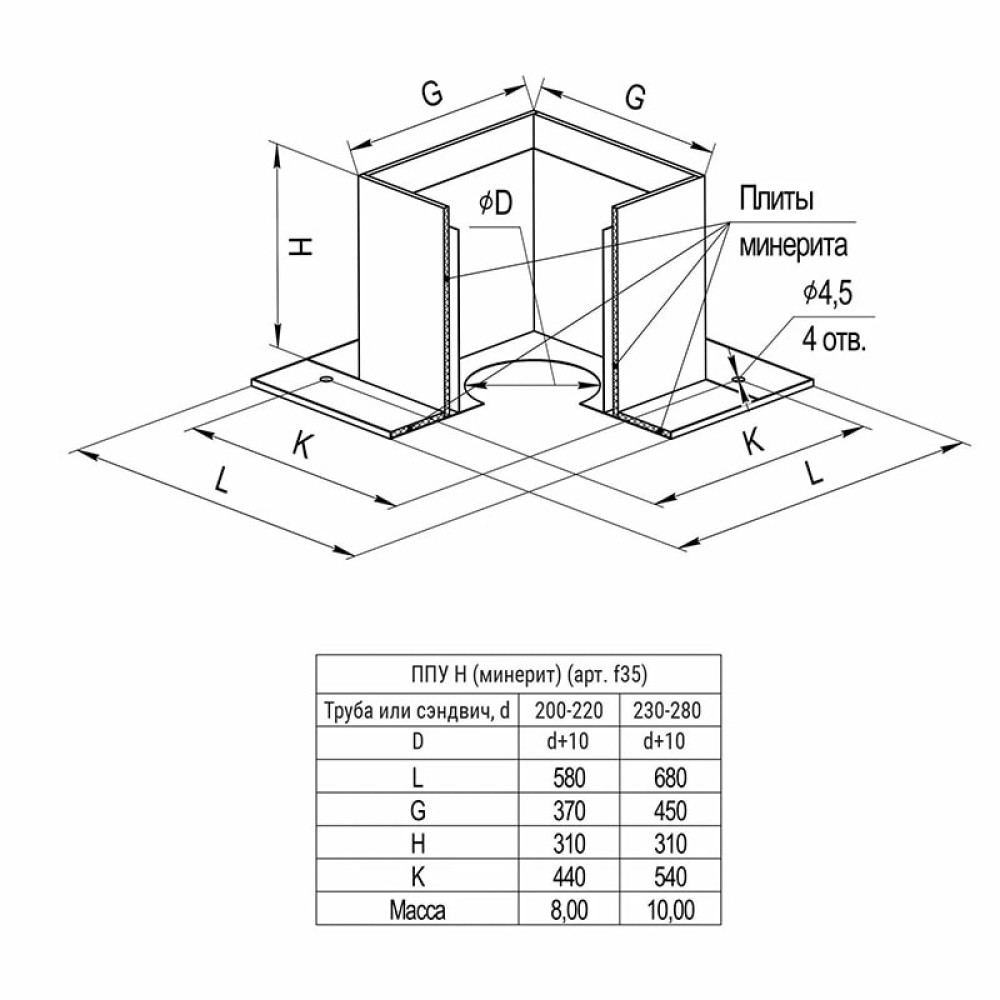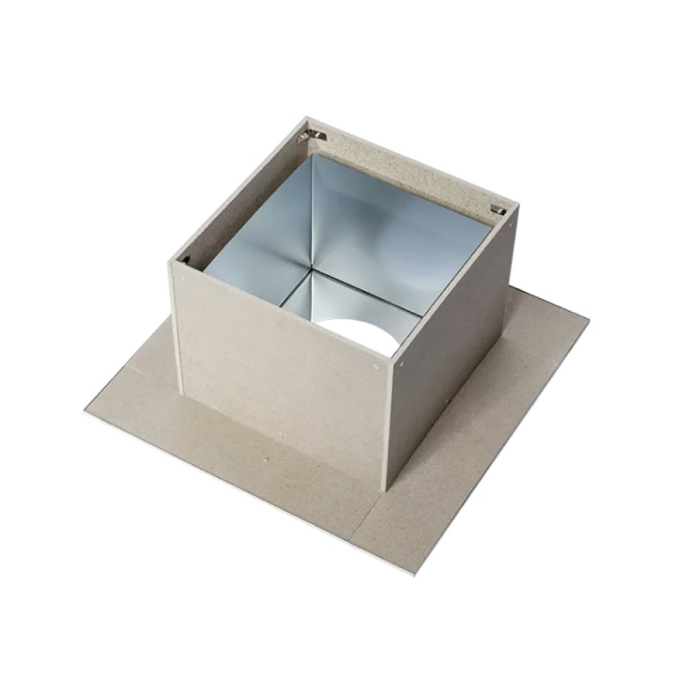Имеет основание квадратной формы с дополнительной изоляцией в виде короба из негорючего материала - "минерита".