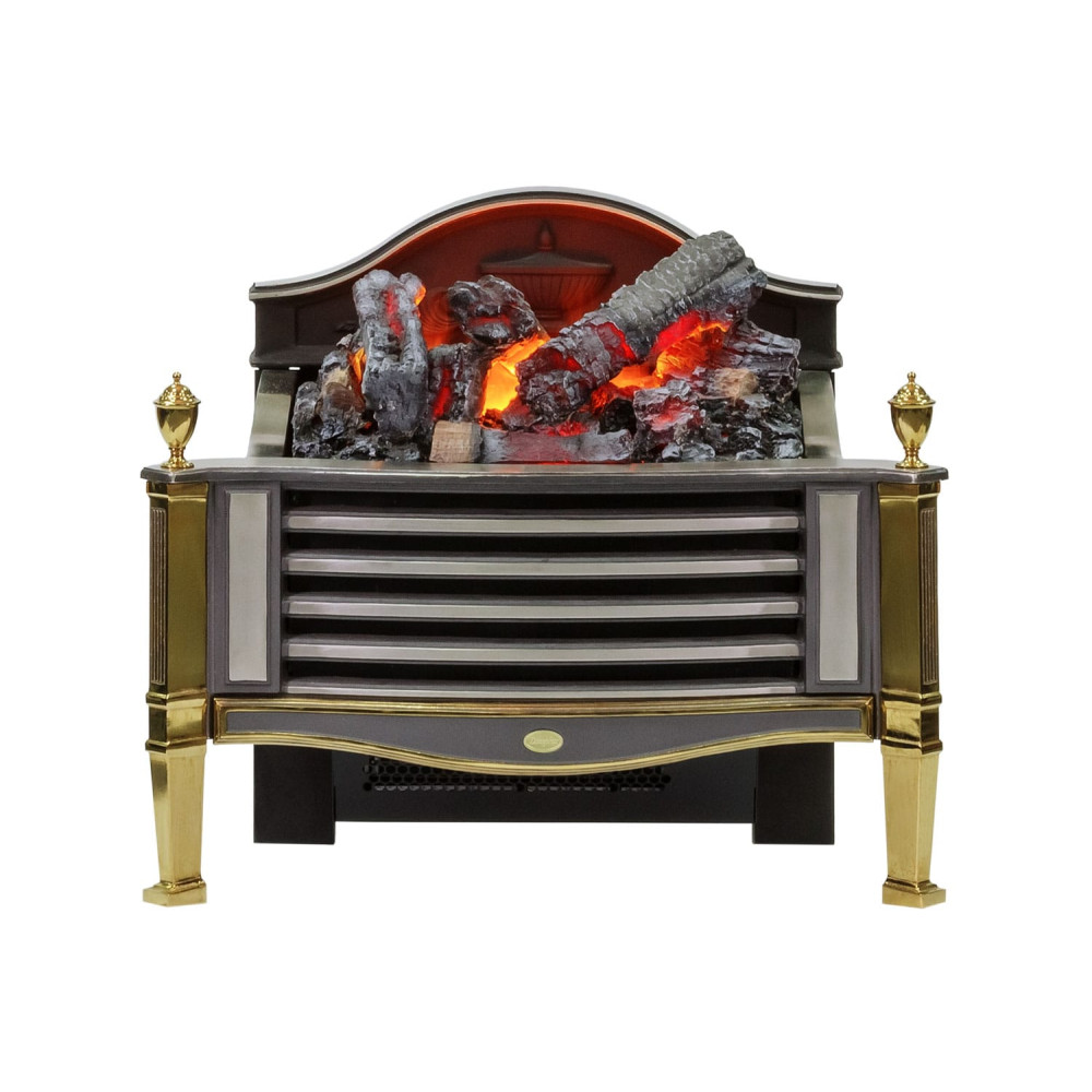 Сам очаг отличается изяществом дизайна - точеные позолоченные ножки поддерживают колосник насыщенного черного цвета, в котором расположены поленья со встроенными светодиодами, что делает их неотличимыми от натурального тлеющего в костре дерева. На задней стенке очага размещены фигурные флористические элементы, которые гармонично сочетаются с общим стилевым решением камина.