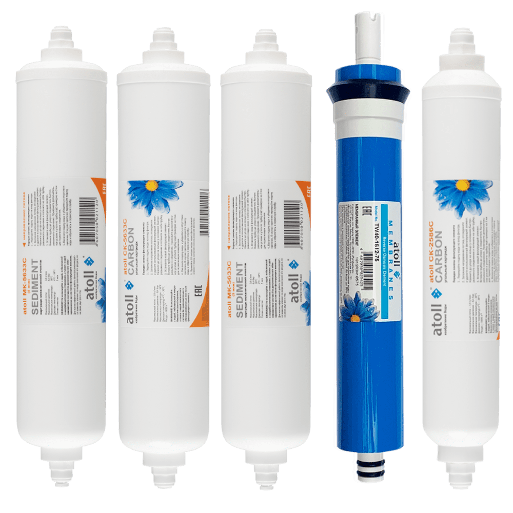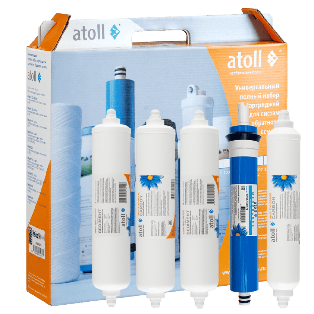 Набор картриджей atoll №104 STDA — это комплект сменных элементов для обратноосмотических систем очистки питьевой воды. Содержит пять оригинальных элементов фильтрации: