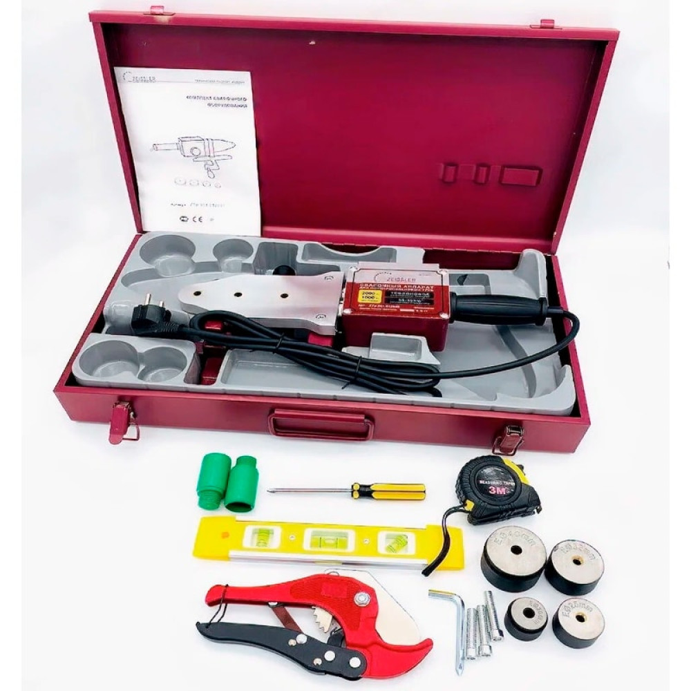 Профессиональный комплект сварочного оборудования для полипропиленовых труб и фитингов, ZEISSLER, арт.: ZTp.901.012040, 2000 Вт, в комплекте с насадками диаметров: 20; 25; 32; 40 мм и многое другое. Аппарат для сварки пластиковых (PPR) труб необходим для монтажа полипропиленовых труб и фитингов. Надежное соединение труб и фитингов достигается за счет качественного процесса сварки.С помощью сварочного аппарата ZEISSLER производится одновременное оплавление обеих ППР деталей с последующим их соединением, после чего на некоторое время происходит фиксация соединения на несколько минут и уже через один час после сварки, трубопровод можно заполнять водой. Оборудование для сварки и все нагревательные элементы следует всегда содержать в чистоте, избегать повреждения тефлонового покрытия, сразу очищать налипший материал грубой салфеткой. Нельзя сварочный аппарат охлаждать водой!