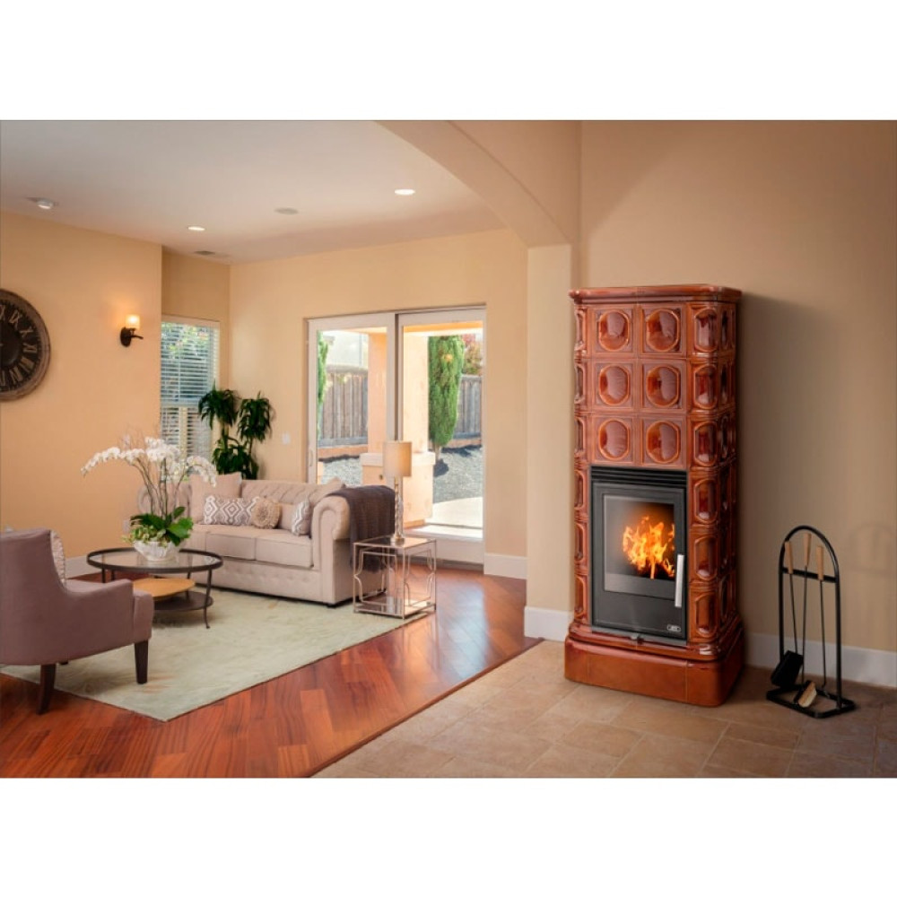 Печь камин ABX KALEDONIE KP I (6,9 кВт в воду) – вставка КОМБО – одна из самых высоких печей облицованная изразцами, в новой модели производитель компания ABX (Чехия) отказался от использования силикона между изразцами, что придало это печи изысканный уникальный вид. Новая топка печи имеет автоматическую регулировку первичного и вторичного воздуха, один рычаг регулировки воздуха позволяет пользователю экономично управлять режимом горения. Печь камин обладает большой мощностью достаточной для отопления помещения от 100 до 240 кубических метров. Топка печи имеет систему вторичного дожига, которая позволяет сжигать дрова полностью при подаче кислорода в верхнюю часть топки. Комбинированная топка печи сделана из стали и внутри футерована вермикулитом, для защиты от перегрева, а дверца и рамка сделаны из чугуна, что дает гарантию долговечной работы топки при высоких температурах. Дровяная печь с водяным контуром подсоединяется к батареям и предназначена для отопления дома за счет циркуляции горячей воды или антифриза. Для правильной и долговременной работы печи необходимо установить систему безопасности состоящую из электронного модуля управления, насоса и расширительного бака. Модульная конструкция печи позволяет компактно упаковать её и без ущерба доставить печь до потребителя. Печь камин ABX KALEDONIE KP I (6,9 кВт в воду) – вставка КОМБО, имеет различные варианты цветов кафеля. В зависимости от вашего предпочтения можно выбрать изразцы песчаного, зеленого, коричневого или перламутрового цвета.
