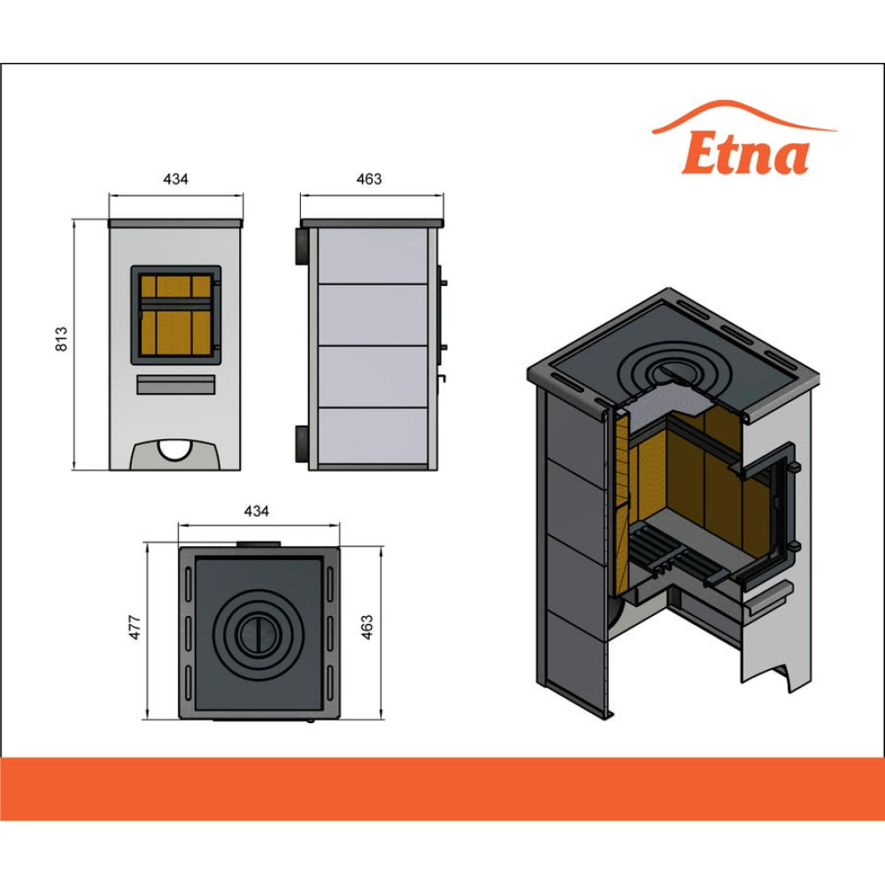 Печь-камин Этна изготовлена из высококачественной конструкционной стали , предназначена для отопления жилых и подсобных помещений до 150 м³. Конвекционно–вентилируемая облицовка, изготовленная из экологически чистой керамической плитки, обладающей большой теплоёмкостью, что позволяет в короткие сроки нагреваться и максимально долго удерживать стабильную температуру. Плитка хорошо поглощает влагу , а при пересушенном воздухе напротив ее отдает , что позволяет поддерживать комфортную атмосферу в помещении. Печь оснащена чугунной дверцей с жаростойким стеклом и чугунной колосниковой решеткой которая при нагревании не деформируется и обеспечивает отличный приток воздуха в топочную камеру. Чугунная варочная плита позволит без труда приготовить пищу.