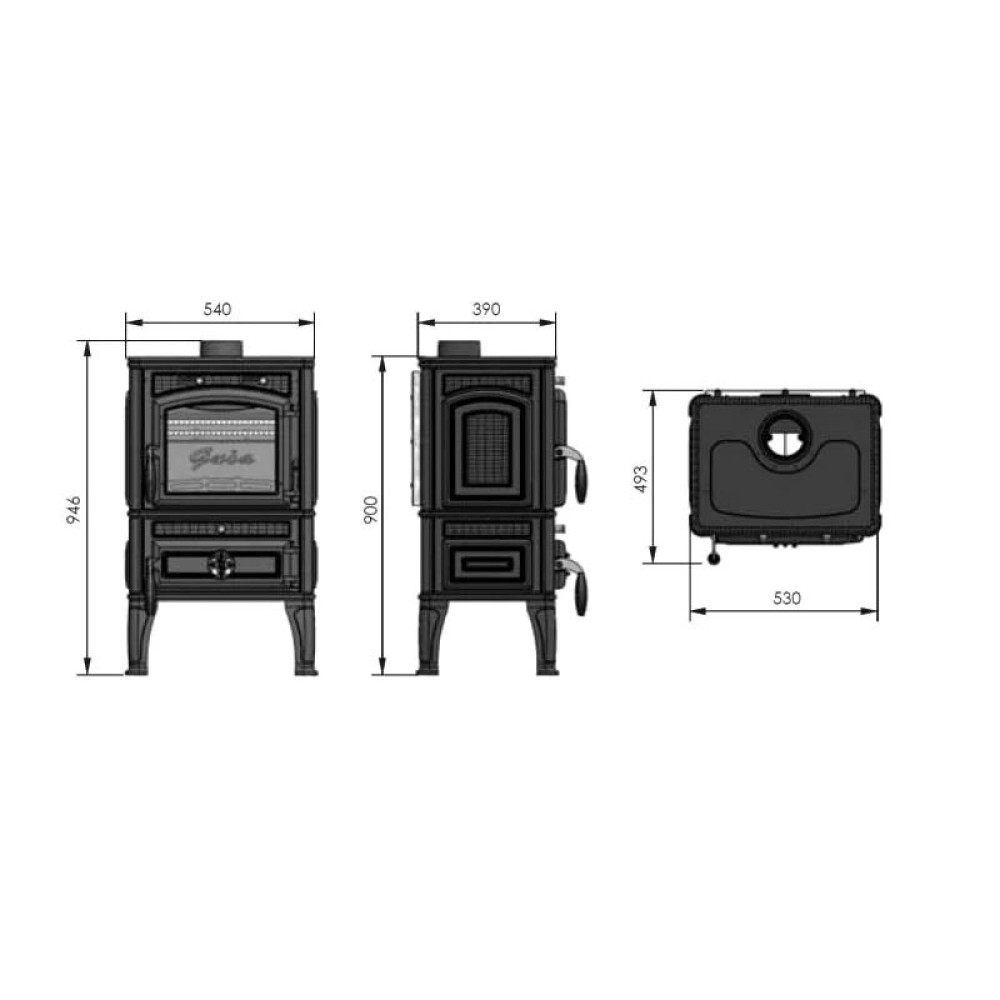 Печь-камин Guca Lava – классический прямоугольник, габариты 946х540х493 мм. Объёмистая топка рассчитана на использование типичных каминных дров длиной 30-40 сантиметров.