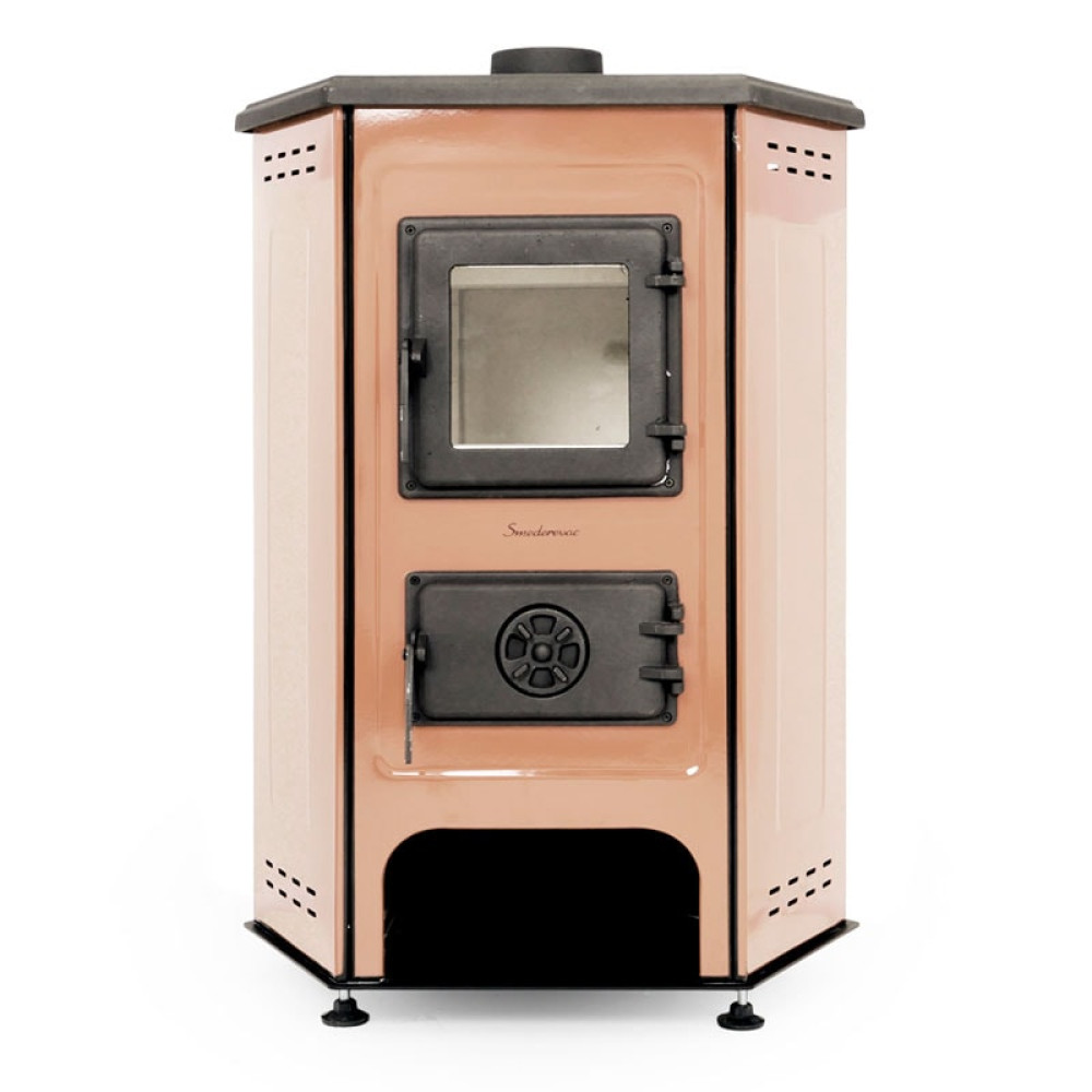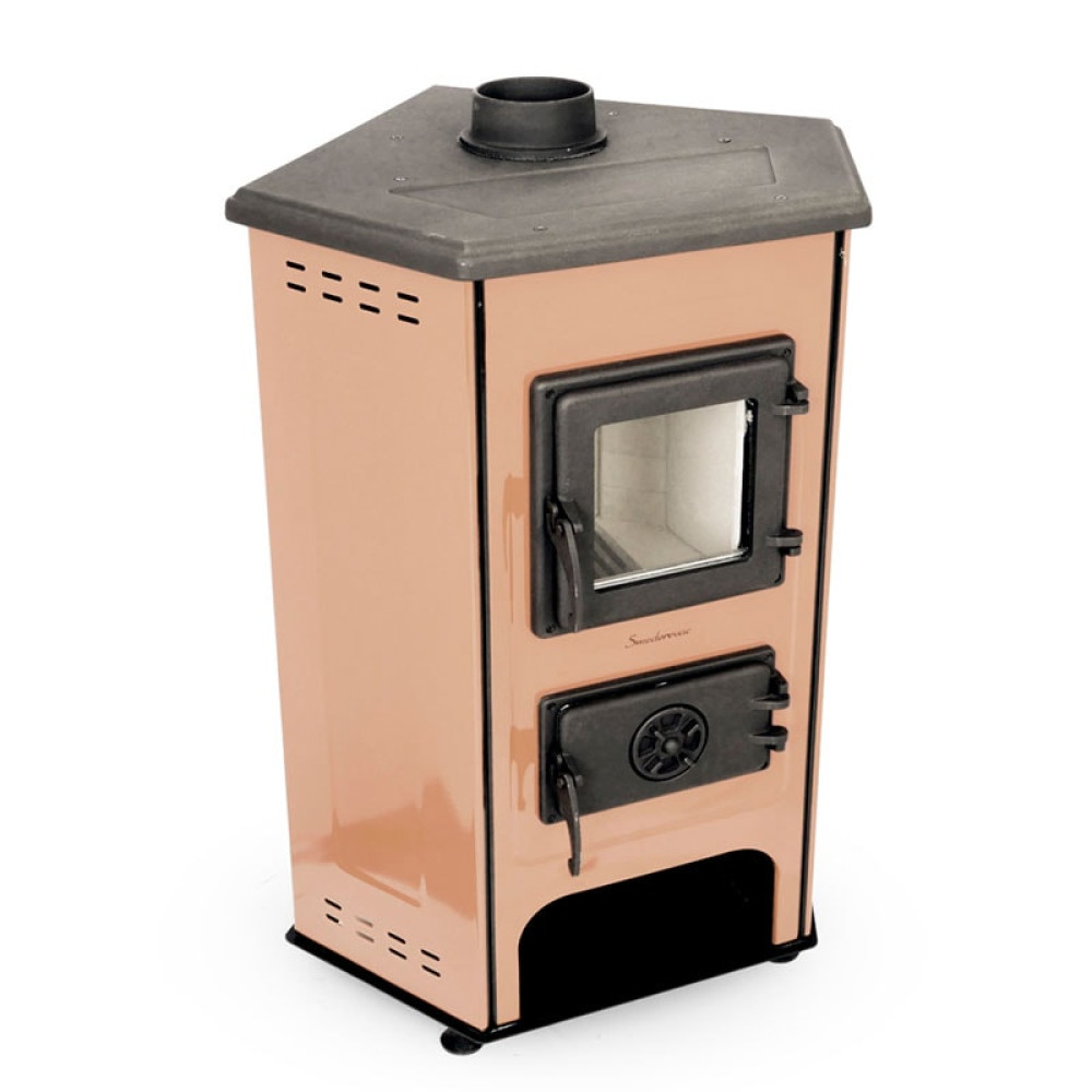 Чугунные элементы печи (зольник, колосник, печные дверцы и верхняя панель) отлично гармонирует со стальными стенками печи, окрашенными в бордовый, черный или бежевый цвет. Подключение дымохода: верхнее, патрубок дымохода крепится двумя болтами и располагается почти посередине верхней крышки печи-камина.