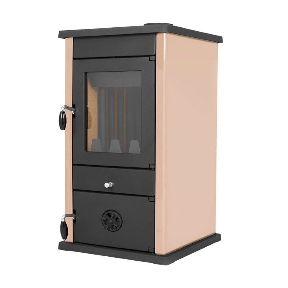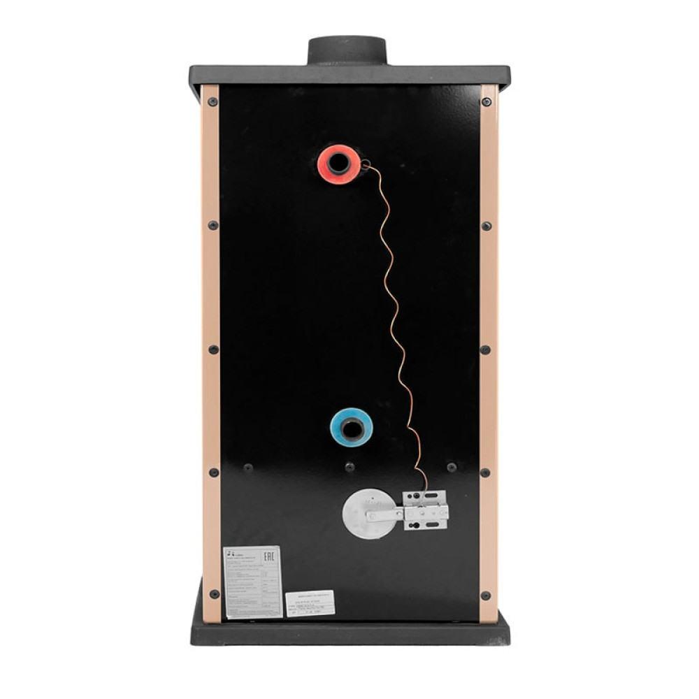 Печь-камин изготовлена из чугуна и эмалированной стали. Эмалированное покрытие обеспечивает продолжительный срок службы печи и отвечает за эстетичный внешний вид. Доступно три цвета эмалированного покрытия: красный, кремовый и бордовый. Для подключения к системе водяного отопления используется теплообменник-змеевик объёмом 4л и мощностью 7,1 кВт. Топочная камера футерована плитами из вермикулита, позволяющими выравнивать перепады температуры и продлить срок службы прибора. Лицевая часть печи выполнена из чугуна. Дверца топки укомплектована немецкой термостойкой стеклокерамикой. Замок и уплотнительный шнур обеспечивают герметичное закрывание дверцы.