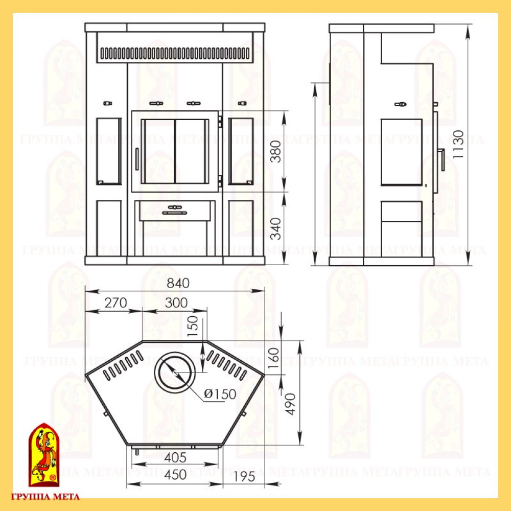 Печь камин имеет следующие размеры: высота: 1130 мм, ширина: 840 мм, глубина: 490 мм.