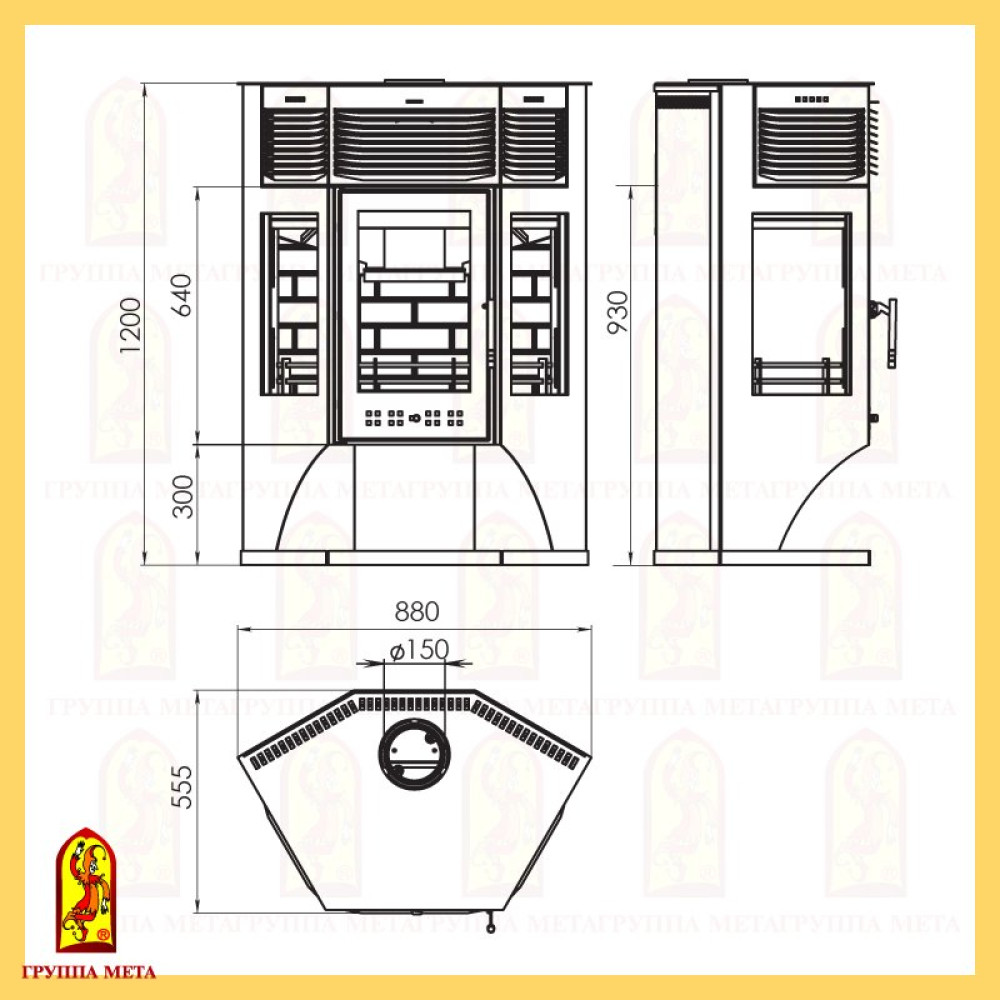 Размеры печи камина: высота - 1200 мм, ширина - 880 мм, глубина - 555 мм.