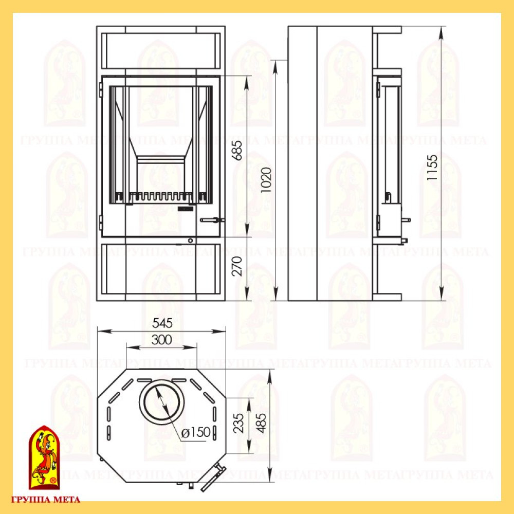 Размеры печи камина: высота - 1155 мм, ширина - 545 мм, глубина - 485 мм.
