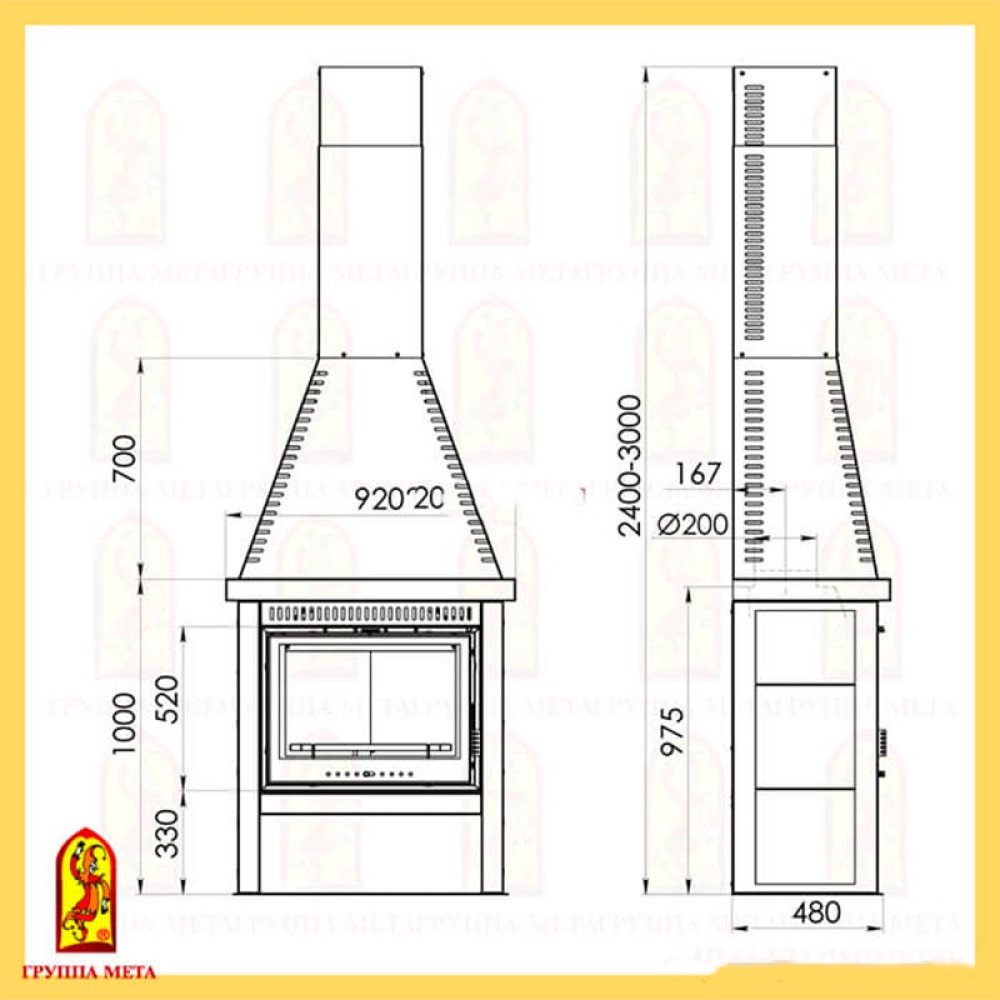 Размеры печи камина: высота - 1000 мм, ширина - 920 мм, глубина - 500 мм.