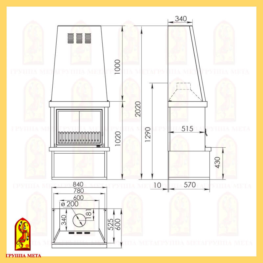 Размеры печи камина: высота - 2020 мм, ширина - 840 мм, глубина - 600 мм.