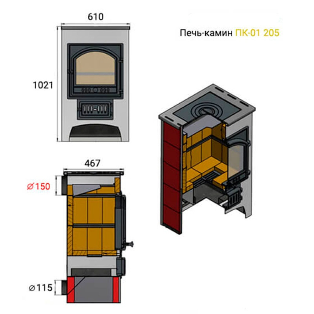 Корпус печи камина выполнен из стали и облицован декоративной керамикой. Стальные печи быстро прогревают воздух в помещении. Начинают давать тепло уже через 15 минут после растопки. Дверца печи камина декорирована стеклом. Такие стекла делаются всего в 2 странах: Германии и Японии. Оно выдерживает температуру до 750 градусов. Но если ударить кочергой, то может треснуть. Через стекло вы любуетесь огнем, следите за прогоранием дров и подкладкой новых. В этой печи использовано прямое остекление.