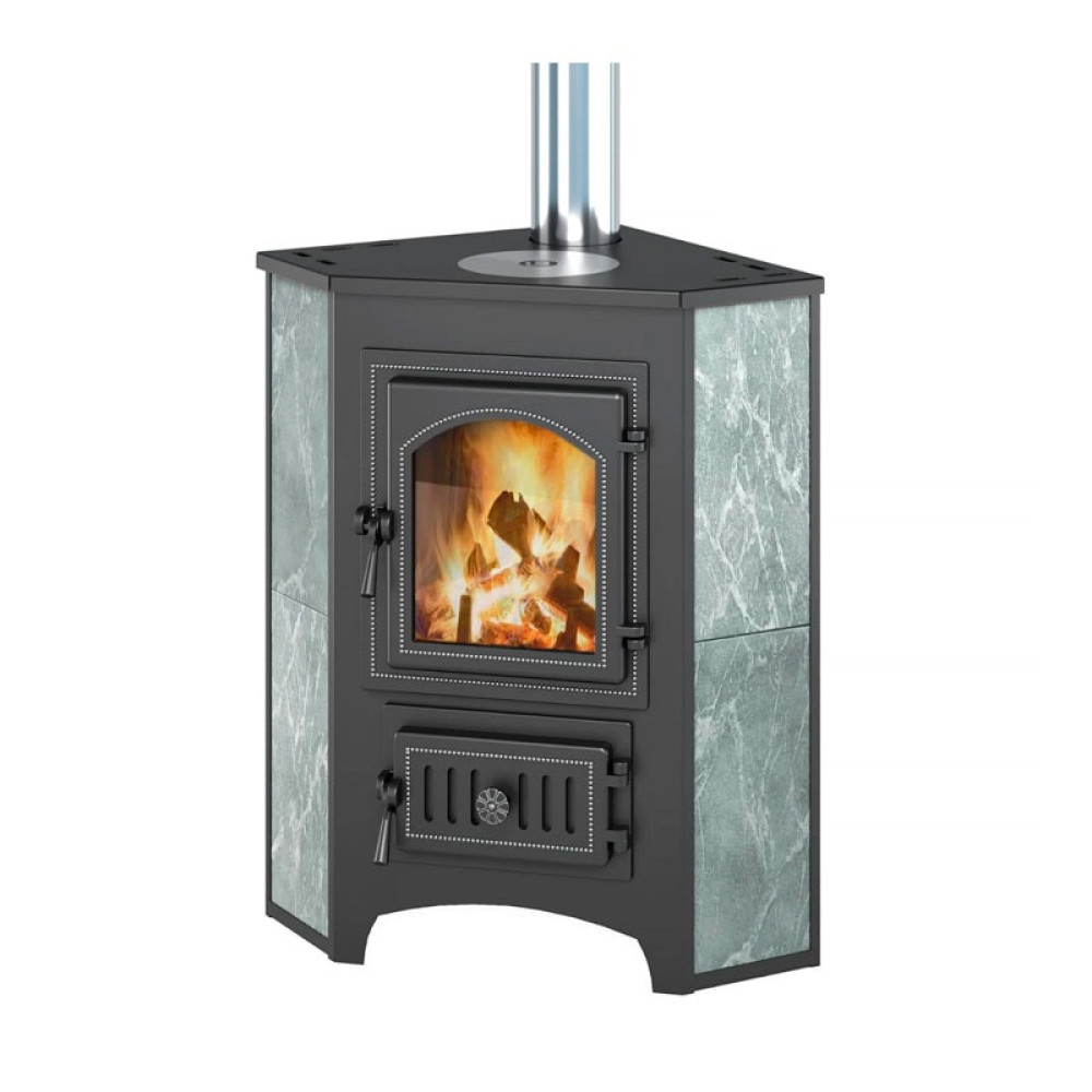 Корпус печи камина выполнен из стали и облицован декоративной керамикой. Стальные печи быстро прогревают воздух в помещении. Начинают давать тепло уже через 15 минут после растопки. Дверца печи камина декорирована стеклом. Такие стекла делаются всего в 2 странах: Германии и Японии. Оно выдерживает температуру до 750 градусов. Но если ударить кочергой, то может треснуть. Через стекло вы любуетесь огнем, следите за прогоранием дров и подкладкой новых. В этой печи использовано прямое остекление.