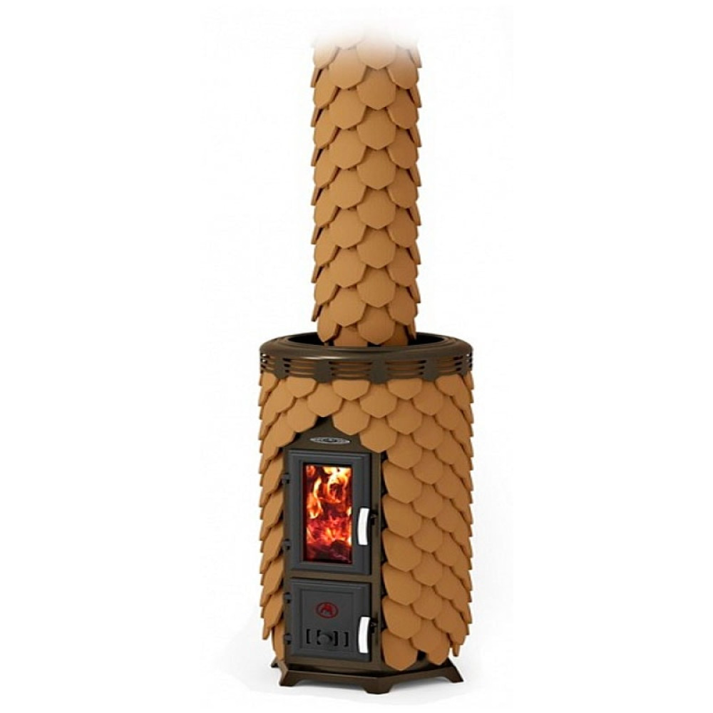 Она не лучит, «не пышет» жаром, а дарит комфортное мягкое равномерное тепло, свойственное кирпичным печам. Облицовка терракотовыми изразцами металлического кожуха печи способствует её более длительному остыванию. Такая керамическая «шуба» отлично аккумулирует тепло, постепенно отдавая его окружающей среде.