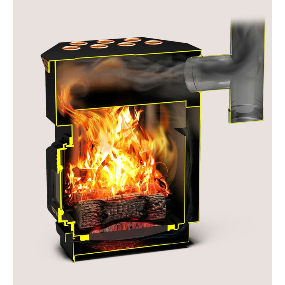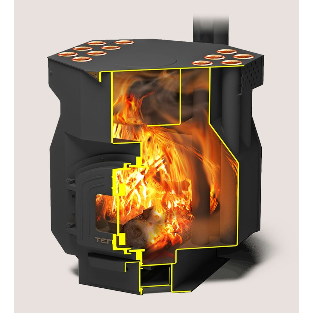 В «ТОП -Драйв» нагрев воздуха помещения происходит в раскаленных трубах печи, которые размещаются непосредственно в топке. Продвигаясь снизу вверх, горячий воздух выходит мощными горячими потоками из конвекционных отверстий и стремительно разносит тепло по комнате.