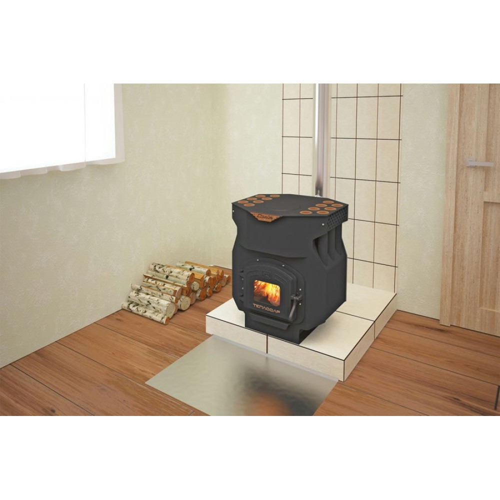 При полной загрузке печи дровами длительность горения составит 8 часов. Герметичная чугунная дверца с запорным механизмом, защитный экран на задней стенке топки с функцией подачи вторичного воздуха и двухоборотная топка «выжмут» из печи максимум!