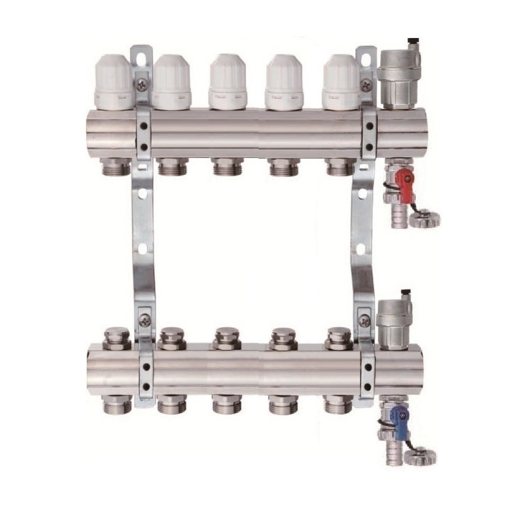 Комплект коллекторной группы из никелированной латуни, в который входит коллектор подачи и обратки, крепёж, регулирующие вентиля, сливной кран и автоматический воздухоотводчик.