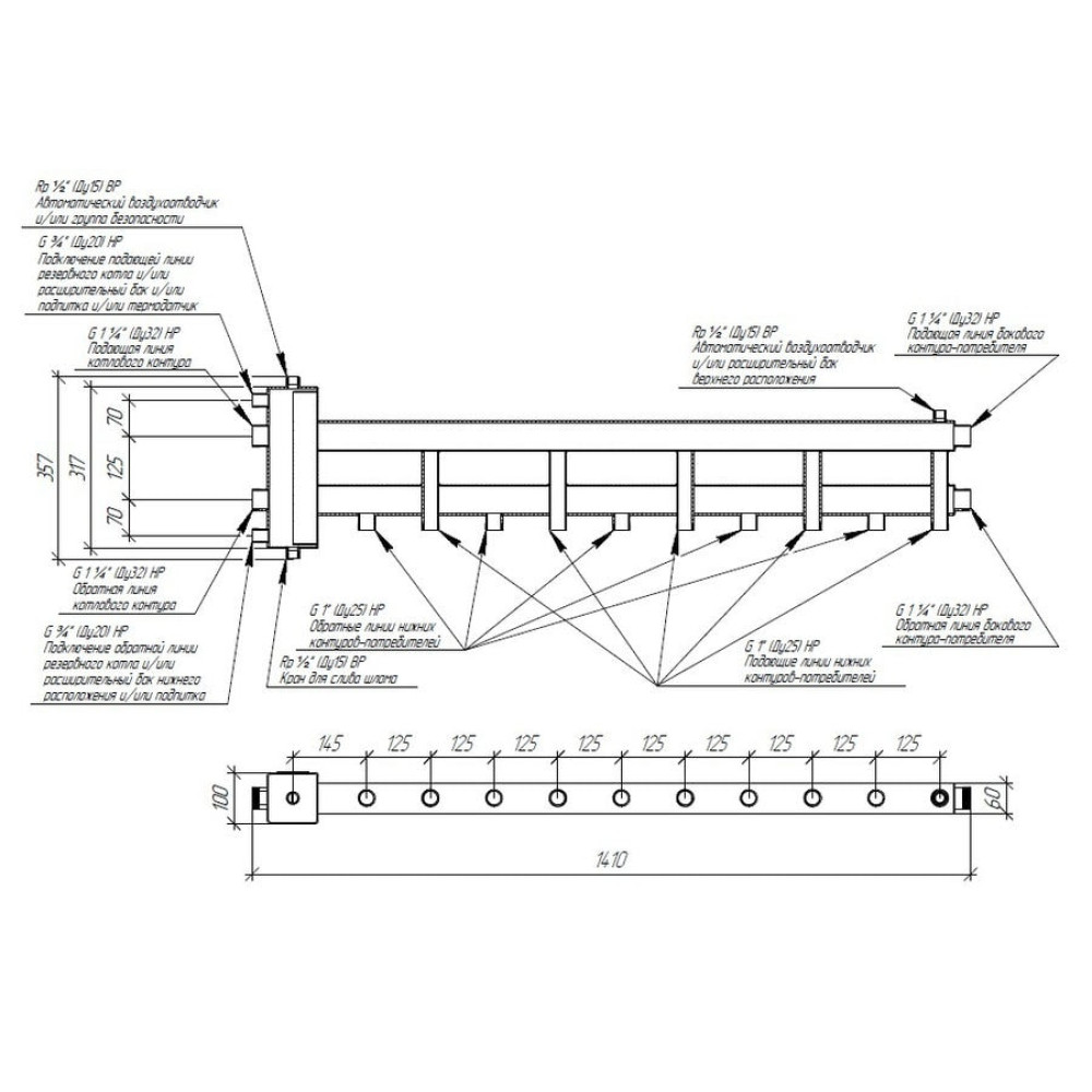 Боковой контур повышенной производительности G 1¼″ позволяет подключать мощные потребители, такие как теплообменники для подогрева бассейнов и вентиляции, а так же расширять кол-во потребителей при расширении хозяйства путем транзитного присоединения любого модульного коллектора серии MK-100.