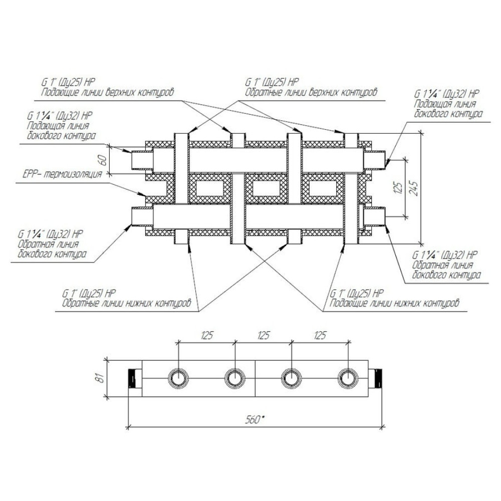Модульный коллектор отопления с термоизоляцией предназначен для распределения и сбора теплоносителя по контурам-потребителям G 1″ и одному G ¼″, где подающая и обратная линия каждого контура расположены в одной плоскости с осевым расстоянием 125 мм.