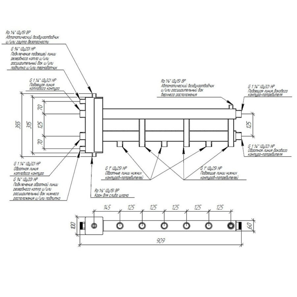 Нержавеющий балансировочный коллектор представляет из себя гидрострелку до 100 кВт с распределительным коллектором. Боковой контур повышенной производительности G 1¼″ позволяет подключать мощные потребители, такие как теплообменники для подогрева бассейнов и вентиляции, а так же расширять кол-во потребителей при расширении хозяйства путем транзитного присоединения дополнительной секции модульных коллекторов MKSS-100.