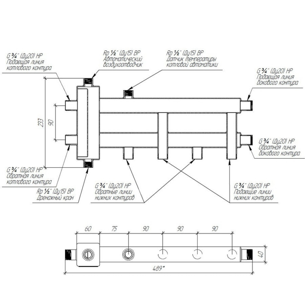 Гидрострелка на 2-3 контура BMSS-40-3D (балансировочный коллектор 2+1) предназначена для систем отопления на базе настенного газового или электрического котла.