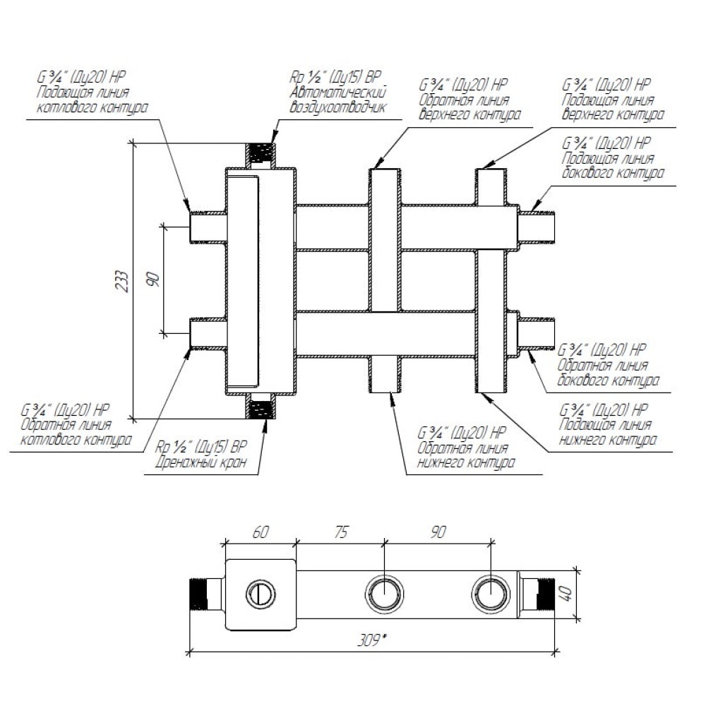 Гидрострелка на 2-3 контура BMSS-40-3DU (балансировочный коллектор 1+1+1) предназначена для систем отопления на базе настенного газового или электрического котла.