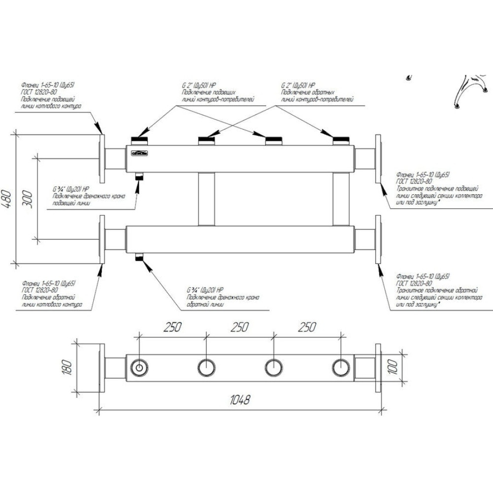 Коллектор фланцевый Ду65 предназначен для распределения теплоносителя по контурам или его сбора в каскад в котельных и ИТП до 400 кВт в условиях повышенной коррозии (жесткой воды, высокой влажности, наличием кислорода в системе из-за полипропиленовых труб).