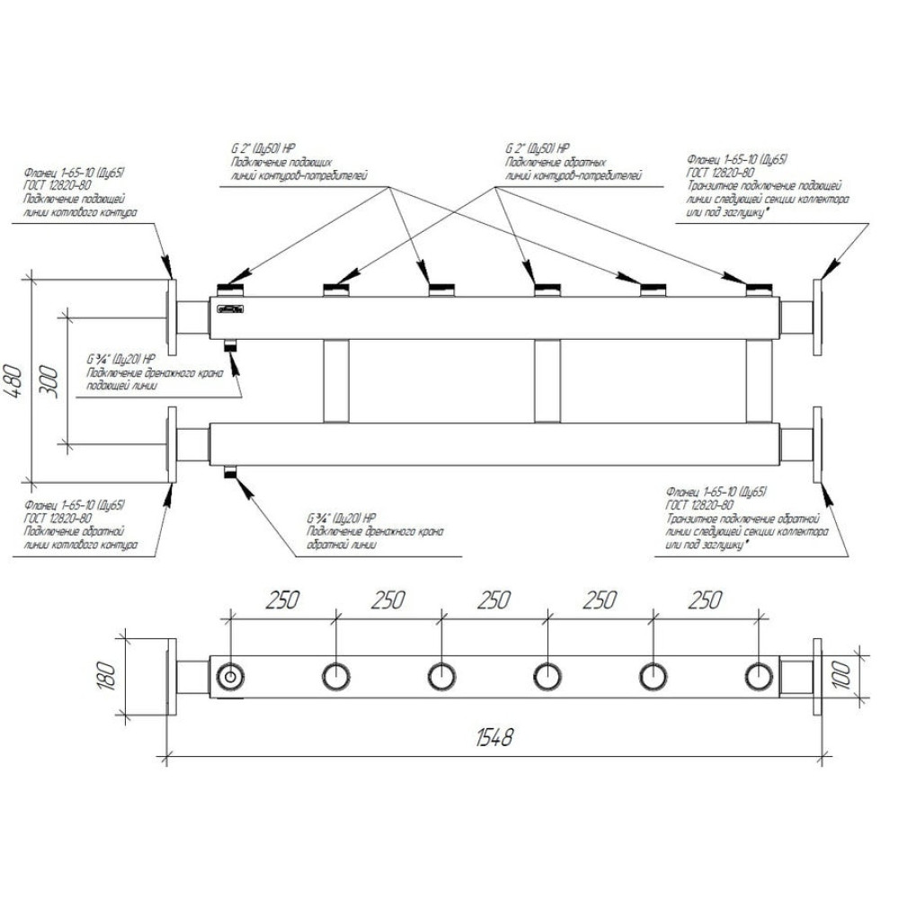 Коллектор фланцевый Ду65 предназначен для распределения теплоносителя по контурам или его сбора в каскад в котельных и ИТП до 400 кВт в условиях повышенной коррозии (жесткой воды, высокой влажности, наличием кислорода в системе из-за полипропиленовых труб).