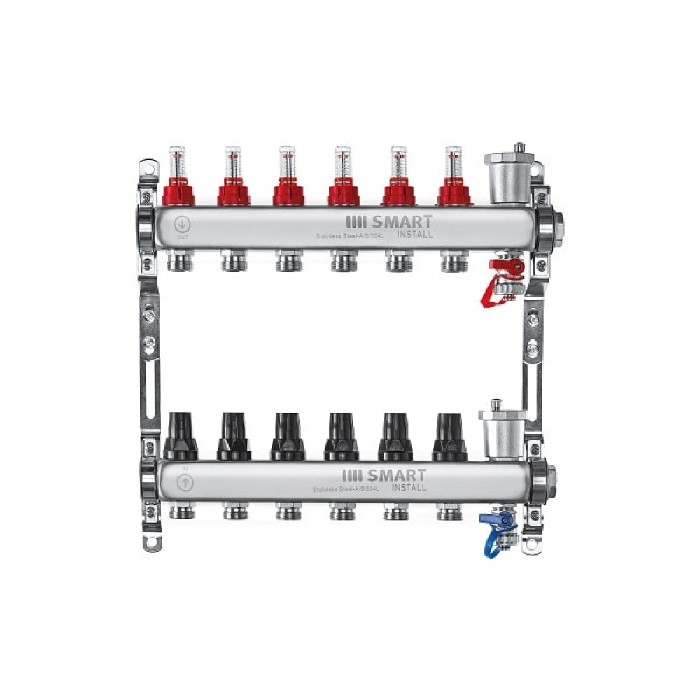 Применяются в качестве распределителя теплоносителя в контуры теплого пола. Для удобства балансировки системы напольного отопления на коллектор установлены расходомеры для визуального контроля и необходимой регулировки расхода теплоносителя в отдельных контурах теплого пола.