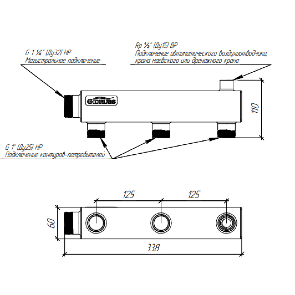 Коллектор распределительный нержавеющий Gidruss DMSS-32-25х3 1 1/4" 3 контура
