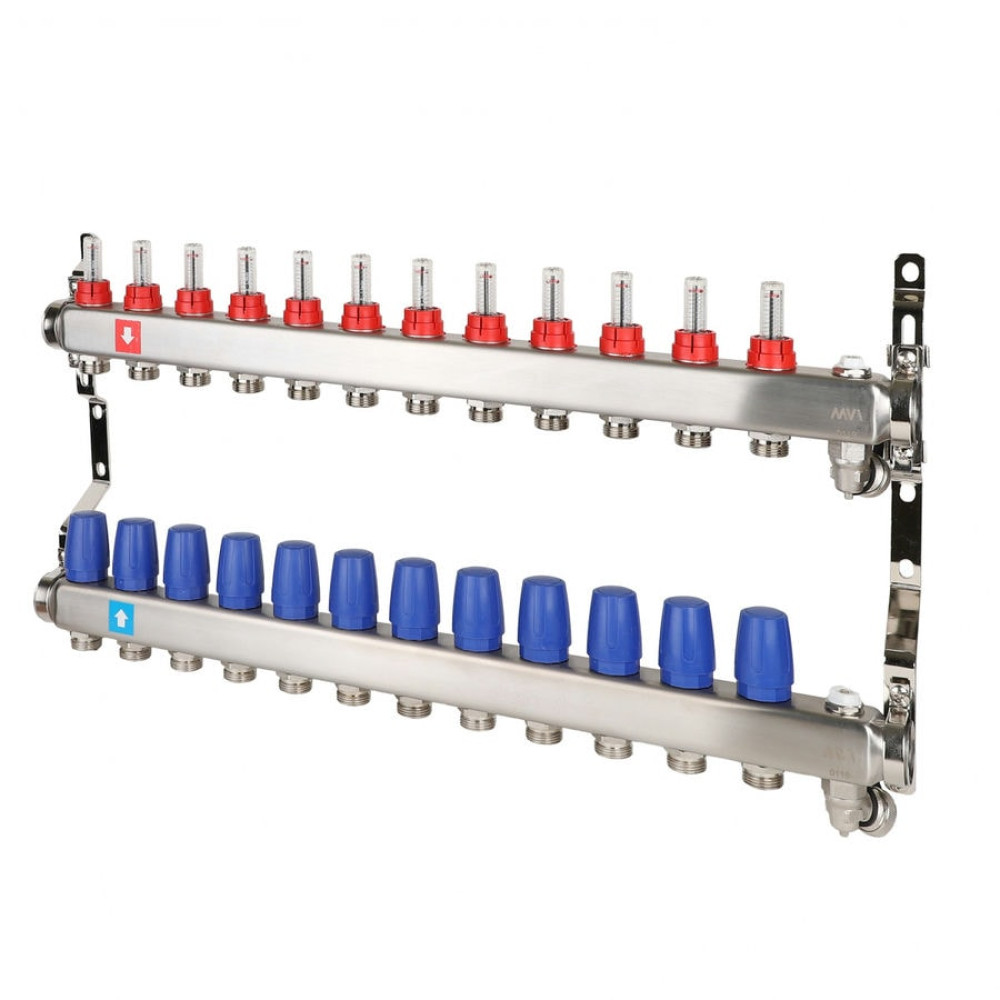 Коллектор с расходомерами дренажным краном и воздухоотводчиком MVI 1"х3/4"ЕК 12 выходов