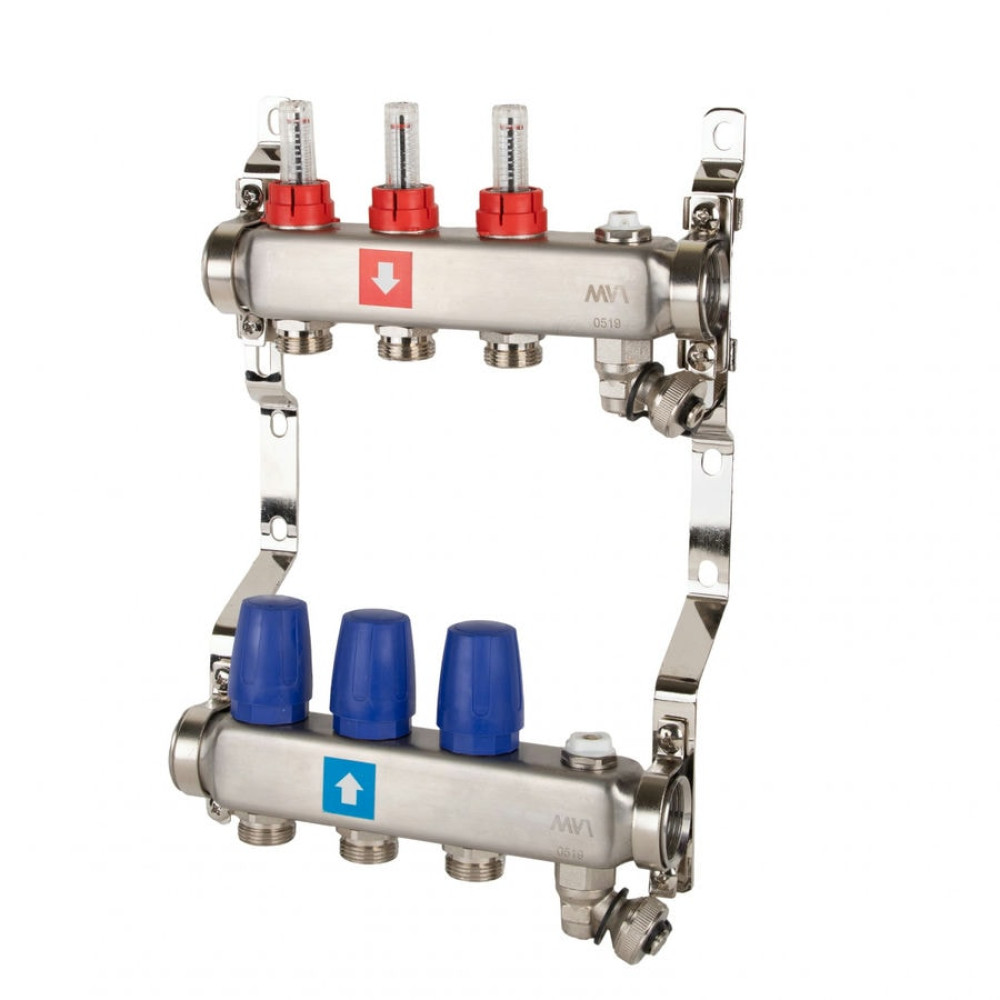 Коллектор с расходомерами дренажным краном и воздухоотводчиком MVI 1"х3/4"ЕК 3 выхода