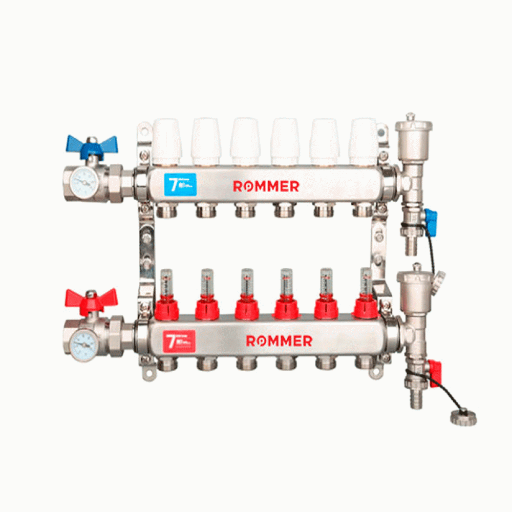 Коллекторные распределительные блоки Rommer состоит из подающей и обратной гребенок, каждая из которых имеет от 2 до 12 выходов. Подающая гребенка имеет возможность отключения (перекрытия) каждого отдельного контура системы отопления или теплого пола, для чего оснащается расходомерами, либо запорно-регулирующими клапанами. Обратная гребенка оборудуется терморегулирующими клапанами с предварительной настройкой пропускной способности. Терморегулирующие клапаны могут быть автоматизированы с помощью термоэлектрических сервоприводов. Для ограничения расхода теплоносителя на каждый отвод выполняется предварительная настройка пропускной способности.