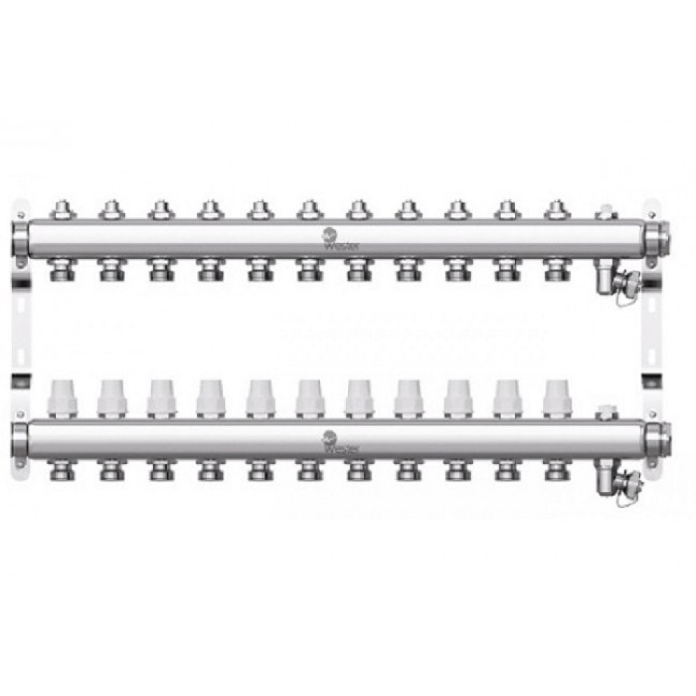 Коллекторы Wester W903 из нержавеющей стали с регулирующими вентилями и запорными клапанами предназначены для оптимизации и контроля распределения теплоносителя в системах радиаторного отопления и подогрева пола.