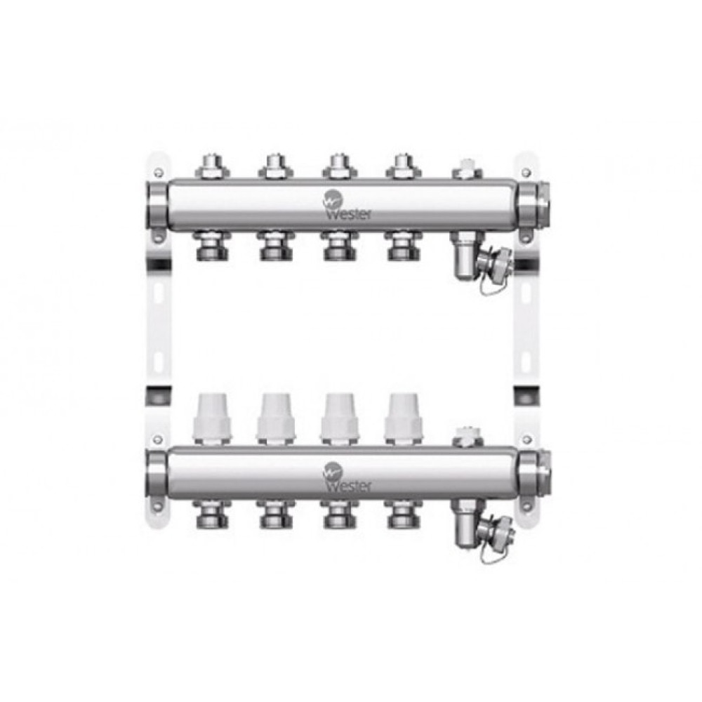 Коллекторы Wester W903 из нержавеющей стали с регулирующими вентилями и запорными клапанами предназначены для оптимизации и контроля распределения теплоносителя в системах радиаторного отопления и подогрева пола.