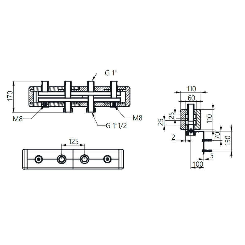 Габаритные размеры коллектора (ВхШхГ) 110х800х110 мм. Межосевое расстояние – 125 мм. Поставляется в комплекте с настенными кронштейнами, набором винтов 2 x M8, 4 x 8/60 мм и анкерами 4 x 10 мм.