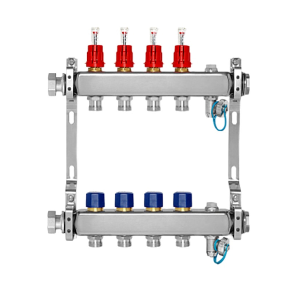 Коллектор из нержавеющей стали для подключения приборов отопления. Полной заводской готовности, с крепежом, ручным воздухоотводчиком, сливным краном. Подключение к системе - посредством накидной гайки с плоским уплотнением.