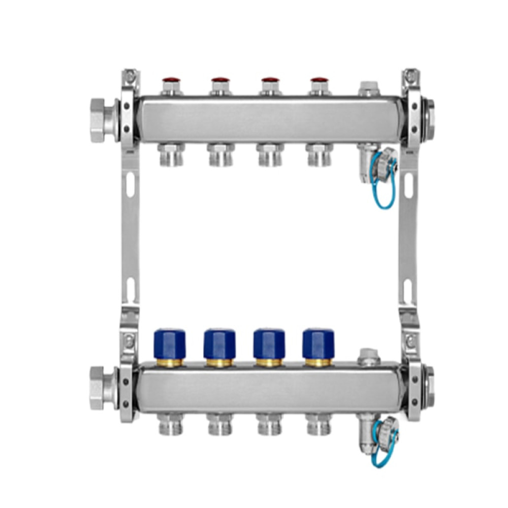 Коллектор из нержавеющей стали для подключения приборов отопления. Полной заводской готовности, с крепежом, ручным воздухоотводчиком, сливным краном. Подключение к системе - посредством накидной гайки с плоским уплотнением.