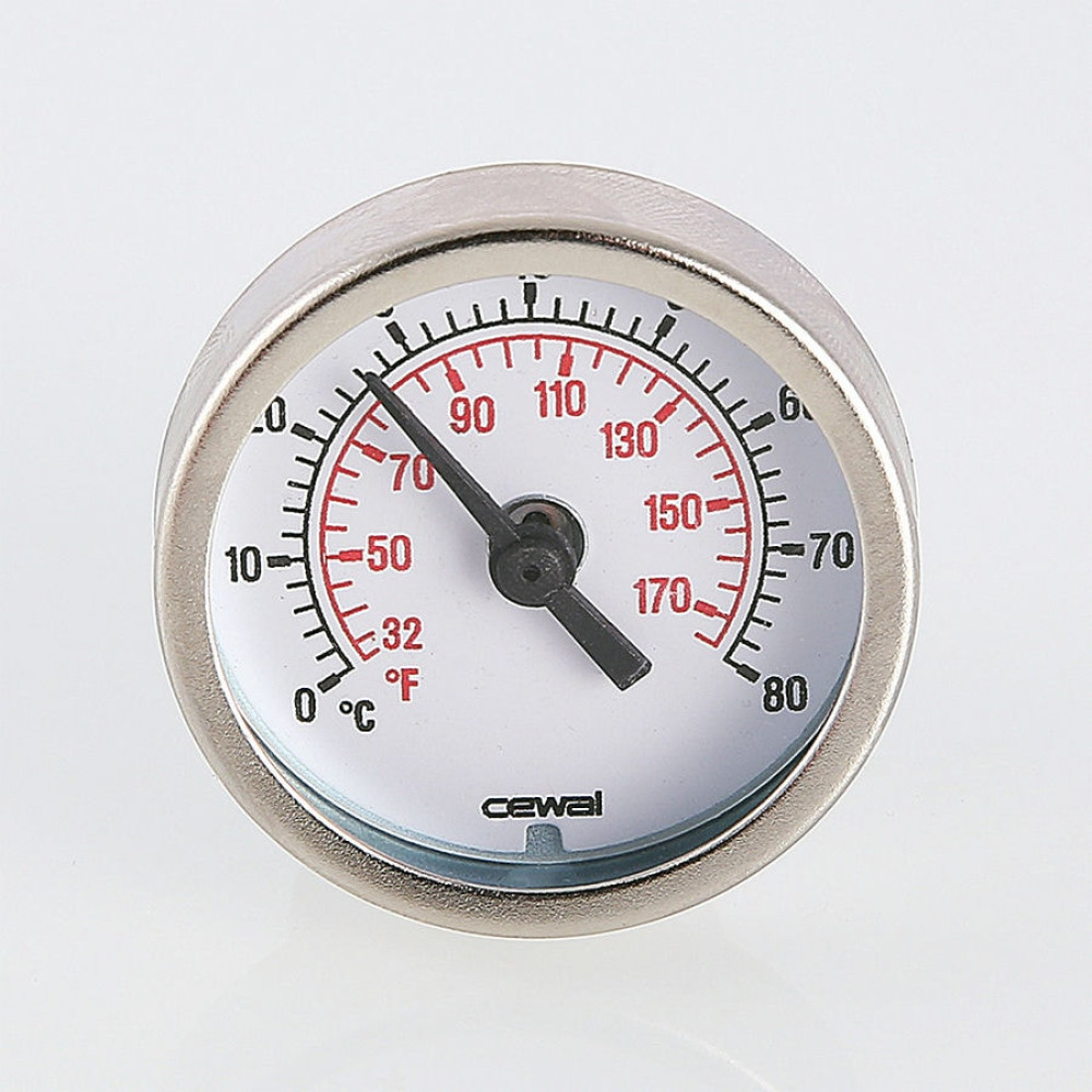 (VT.0617.0) Термометр погружной предназначен для контроля текущей температуры теплоносителя в контурах теплого пола (место установки – коллекторные блоки, насосно-смесительные узлы), других систем водяного отопления либо охлаждения. Диапазон значений измеряемой величины – 0–80 °C. Класс точности прибора – 2. Диаметр циферблата – 41 мм. Материал корпуса термометра – оцинкованная сталь. Термометр имеет тыльное подключение, комплектуется выполненной из латуни CW614N погружной гильзой с наружной присоединительной резьбой 1/2" и уплотнением из EPDM, монтируемой с помощью гаечного ключа. Максимальное рабочее давление в обслуживаемой системе – 10 бар.