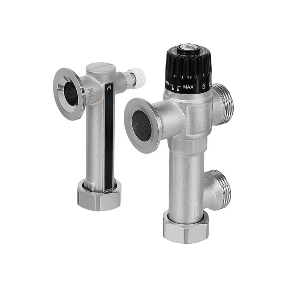 Смесительный насосный узел коллектора тёплого пола, Италия. Предварительно собранная группа для обеспечения регулировки с и циркуляции смешиваемого теплоносителя. Обеспечивает циркуляцию теплоносителя, поступающего из первичного контура, и поддержание постоянной температуры в соответствии с заданным значением с помощью смесительного клапана с термостатическим элементом. Материал: никилерованная латунь + прокладки EPDM. Встроенный термочувствительный жидкокристаллический термометр (индикатор), кристаллы которого меняют цвет при изменении температуры теплоносителя