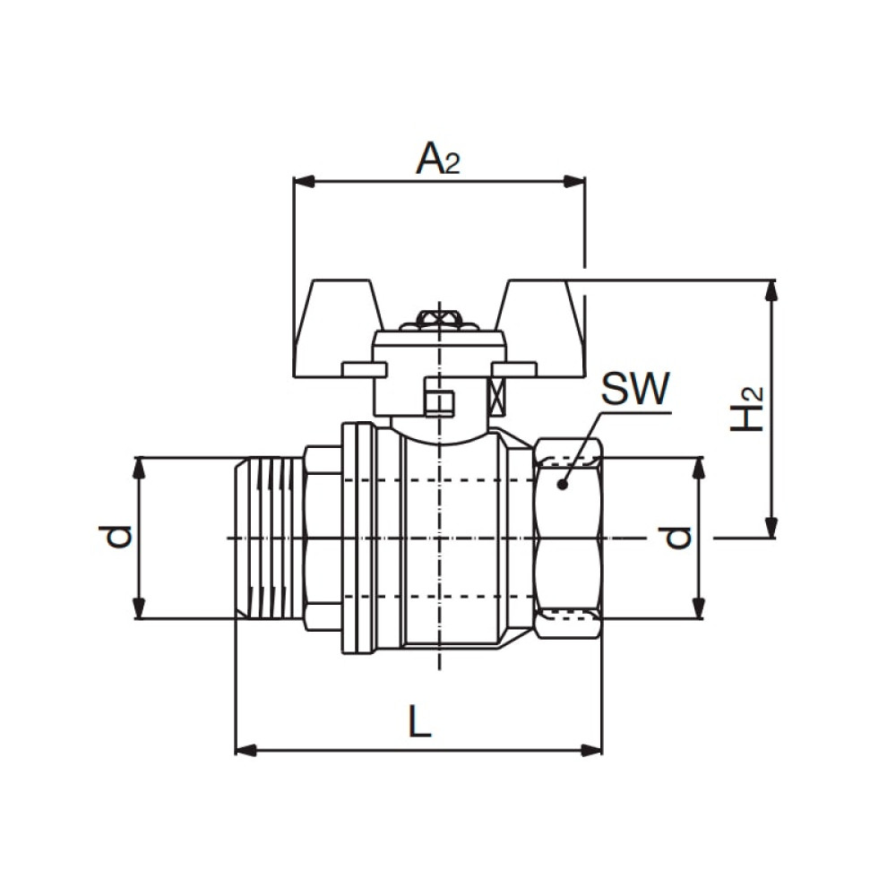 Двухсекционный корпус крана выполен из никелированной латуни, шар - из хромированной латуни. Шаровое уплотнение изготовлено из тефлона (PTFE), уплотнительные кольца - из фторкаучука ("Витона").