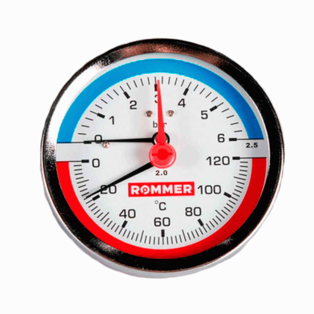 Стрелочные показывающие термоманометры с биметаллическим термочувствительным датчиком, аксиальные и радиальные Rommer – предназначены для мониторинга давления и температуры сред в системах отопления, горячего и холодного водоснабжения, тепло- и холодоснабжения вентиляционных установок.