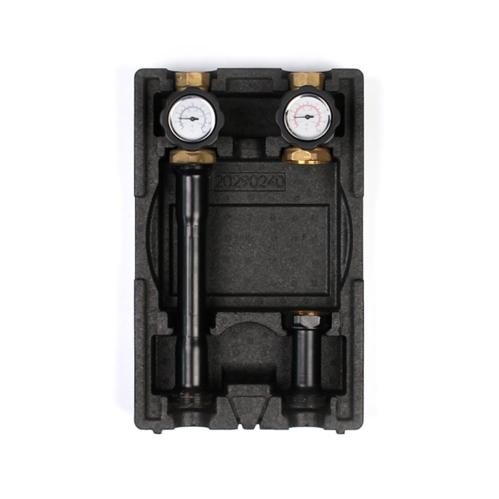 Группа рассчитана на работу при максимальном давлении 0,6Мпа/6 бар и температуре теплоносителя до 110 °С. Подключение к контуру нагревателя, 1 1/2” наружная резьба, находится снизу. Подключение к контуру потребителя 1” внутренняя резьба, располагается сверху.