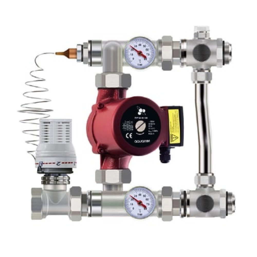 Насосно - смесительный узел для теплого пола TIM JH-1032 — используется для организации автономной принудительной циркуляции, а так же регулирования и дальнейшего поддержания установленных параметров жидкости в контурах с пониженной относительно остальной системы температурой.